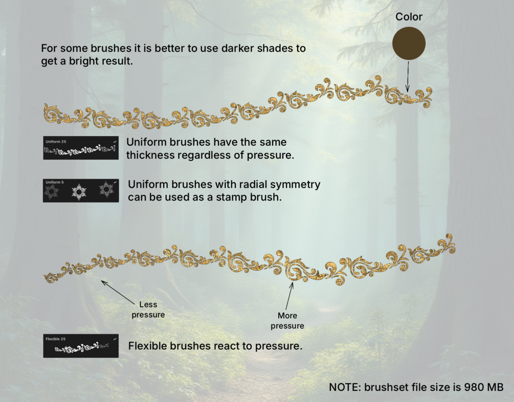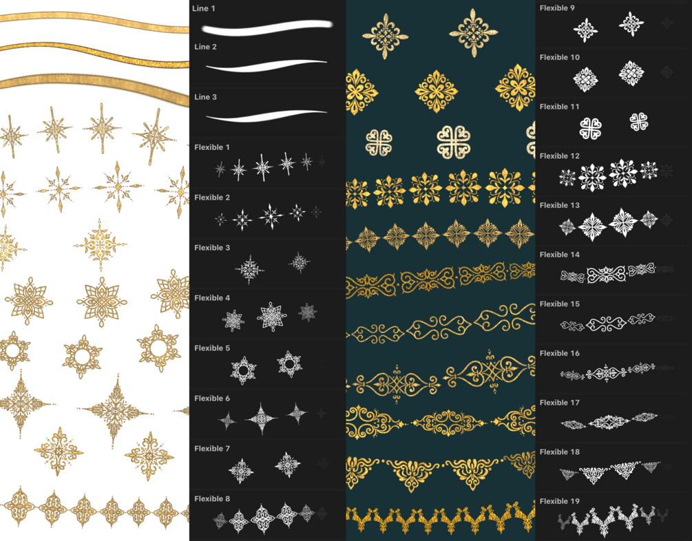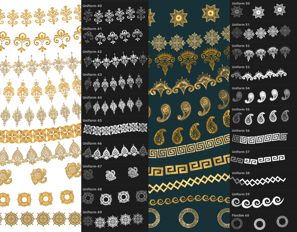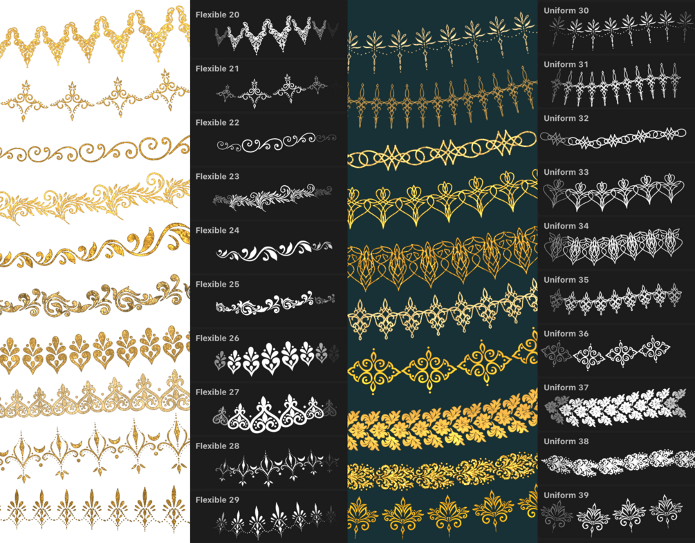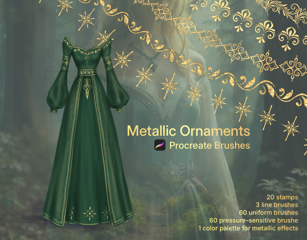 A set of brushes with a realistic shiny metal effect. This set is well suited for architecture, design, fashion illustrations, creating fairy-tale and anime characters. The set contains ornaments in different styles: elven, floral, gothic, baroque, Greek, Indian.